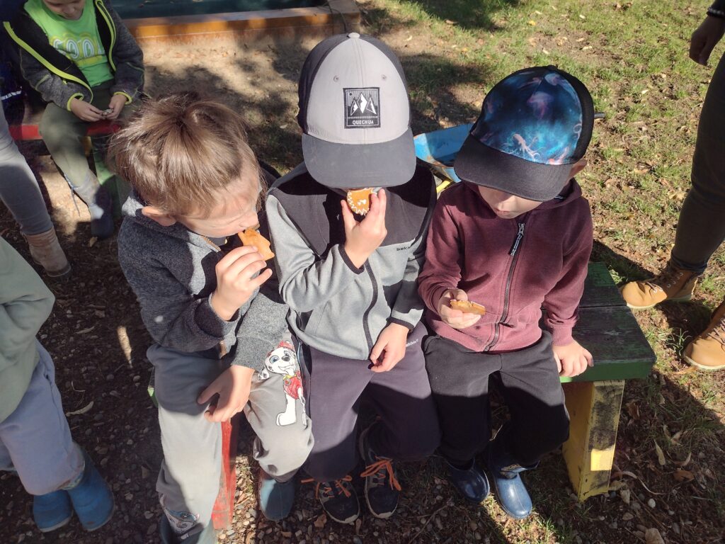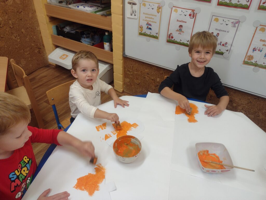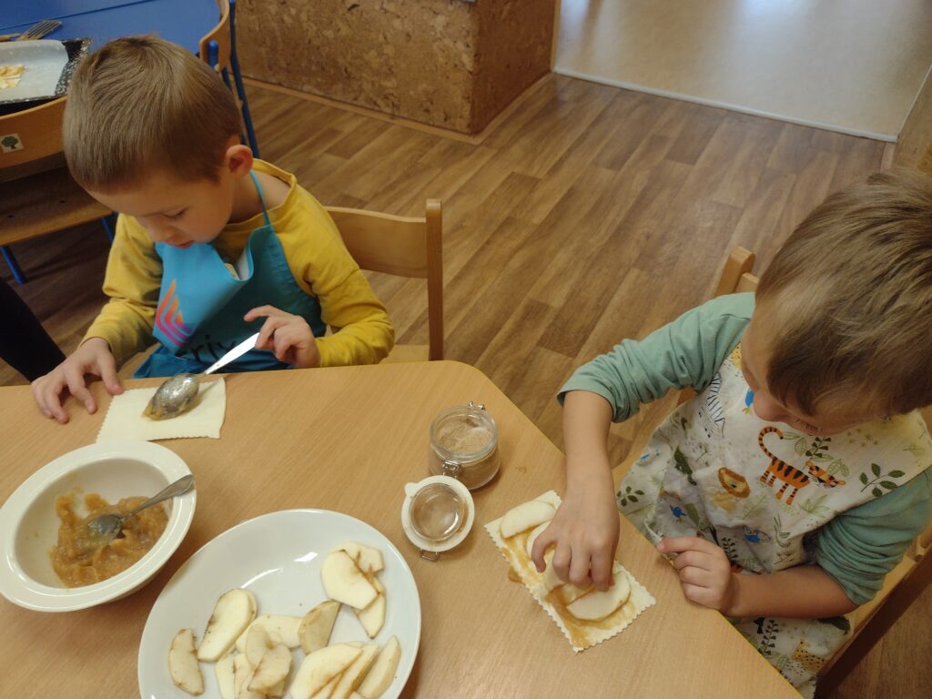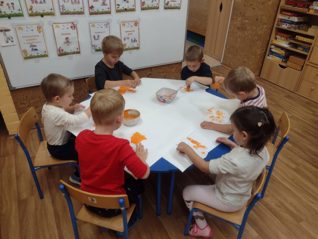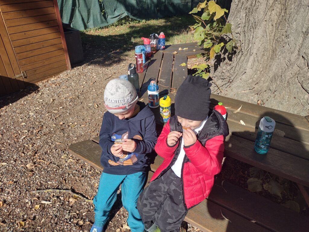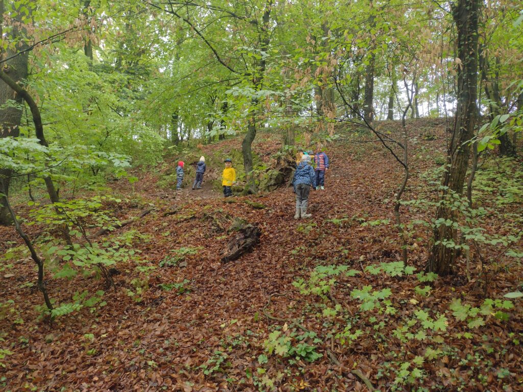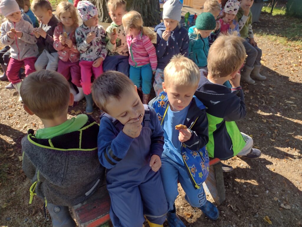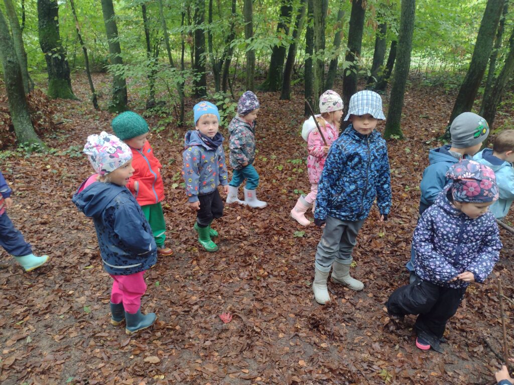 Děti přivítaly podzimní vílu Jabloňku básničkou a písničkou. V lese prozkoumávaly terén a stavěly domečky z přírodnin.