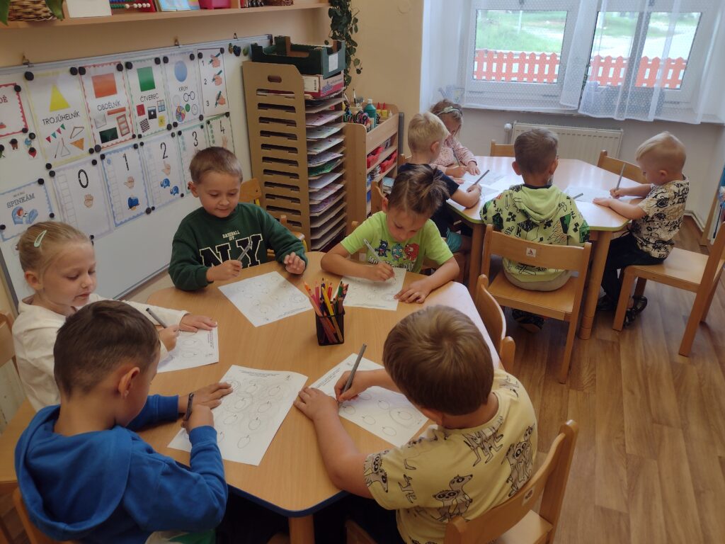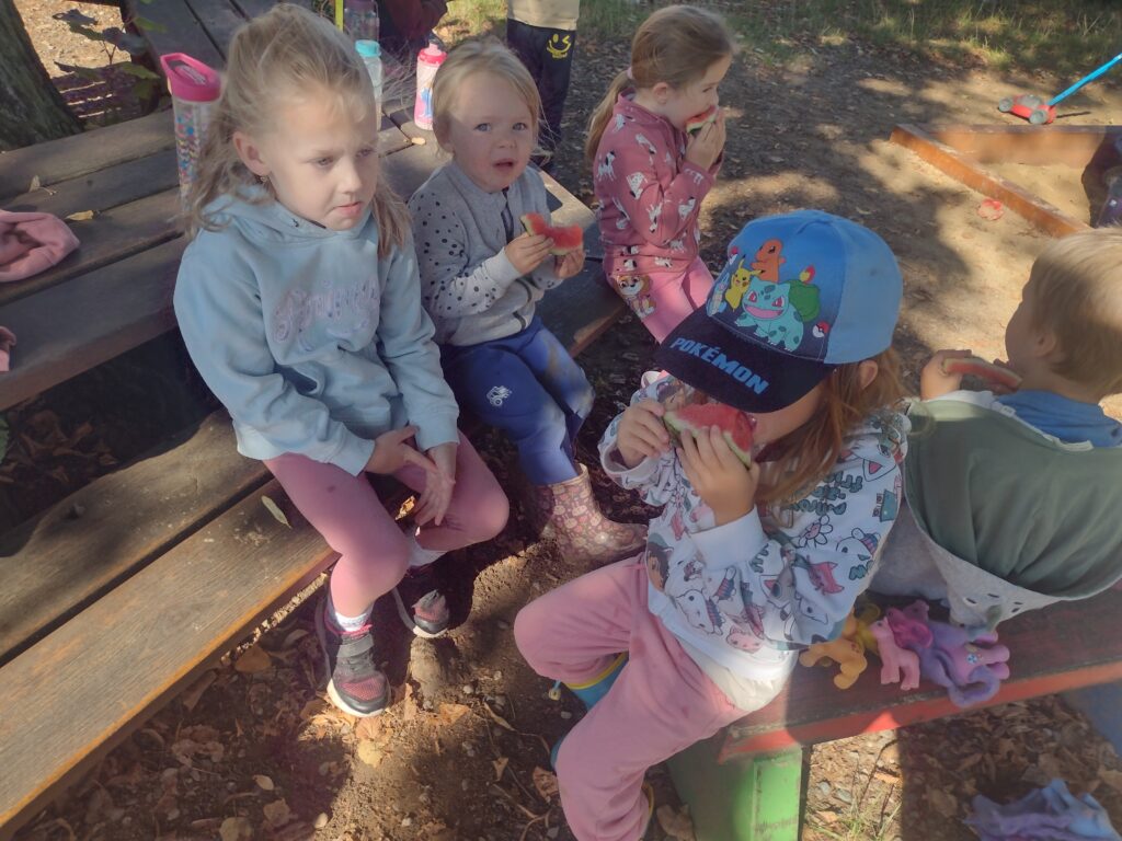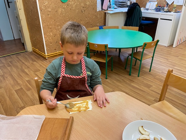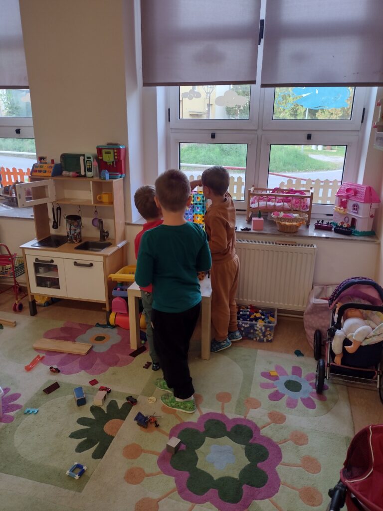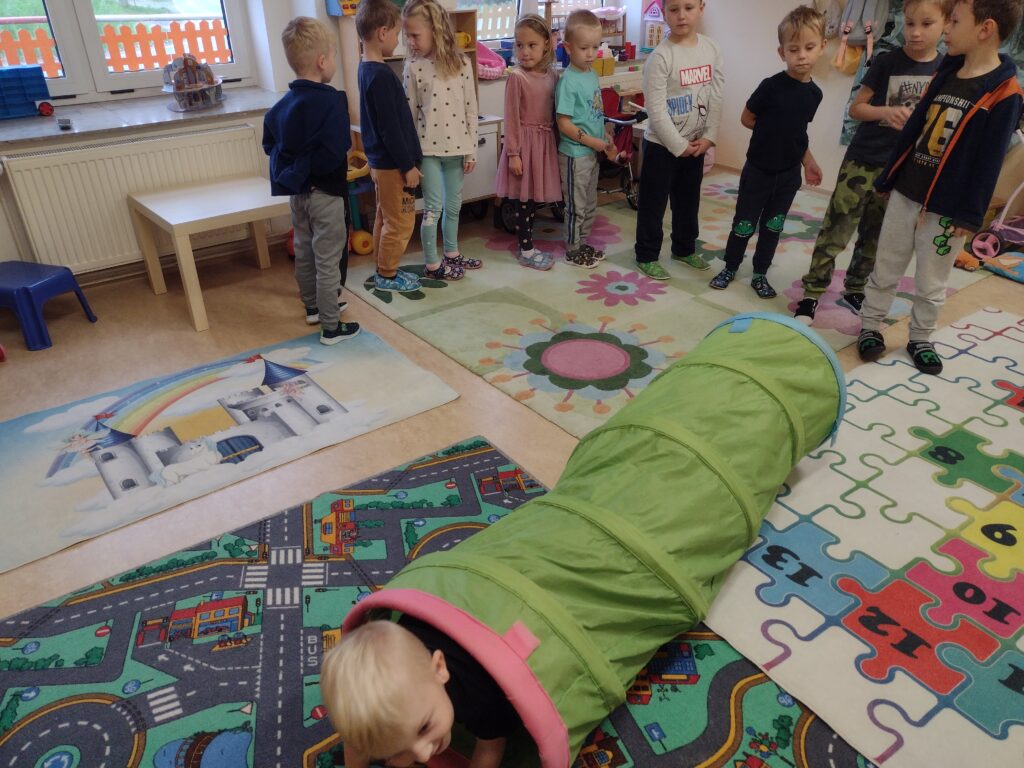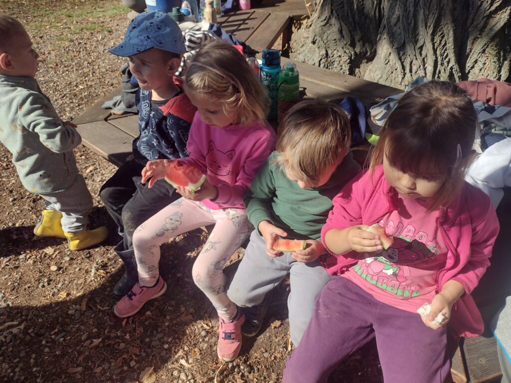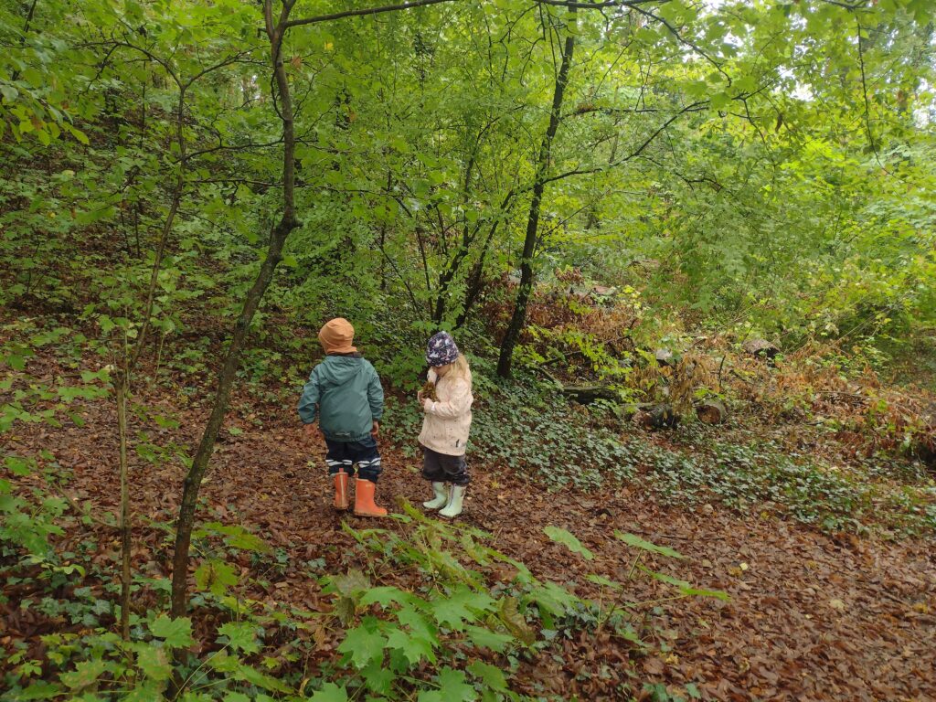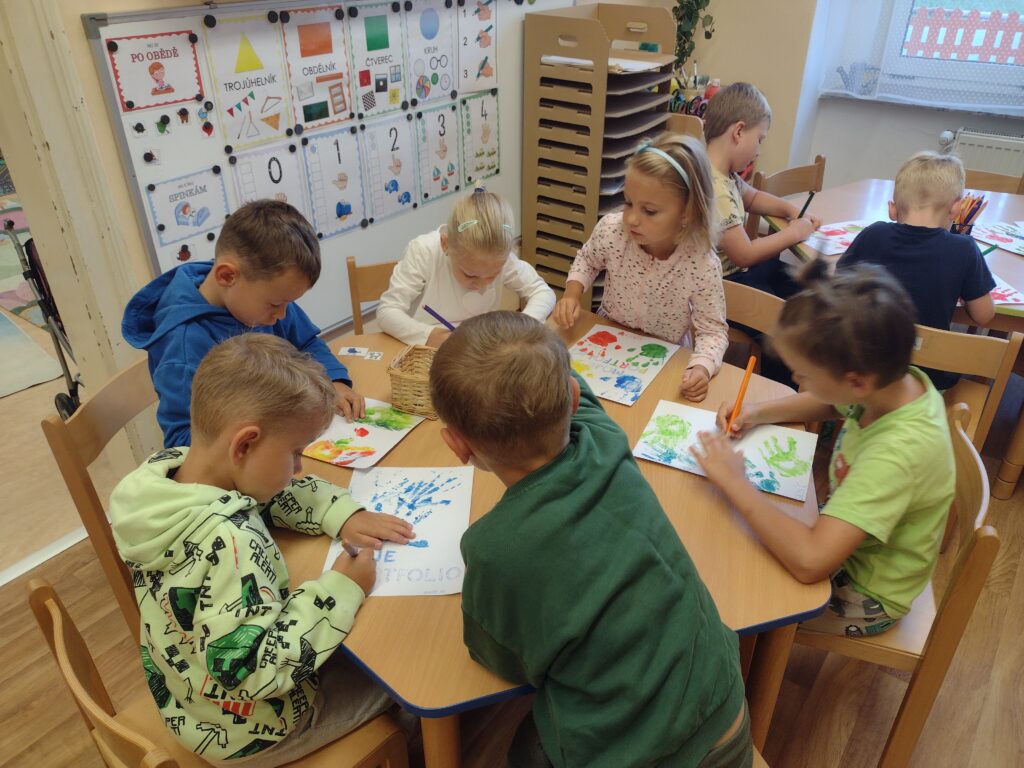 Děti přivítaly podzimní vílu Jabloňku básničkou a písničkou. V lese prozkoumávaly terén a stavěly domečky z přírodnin.