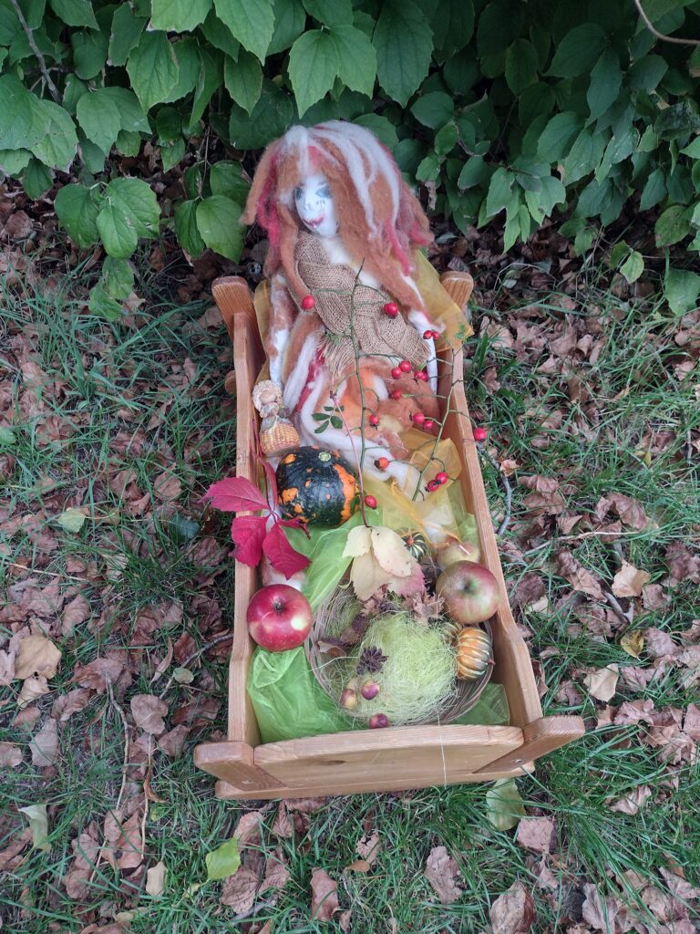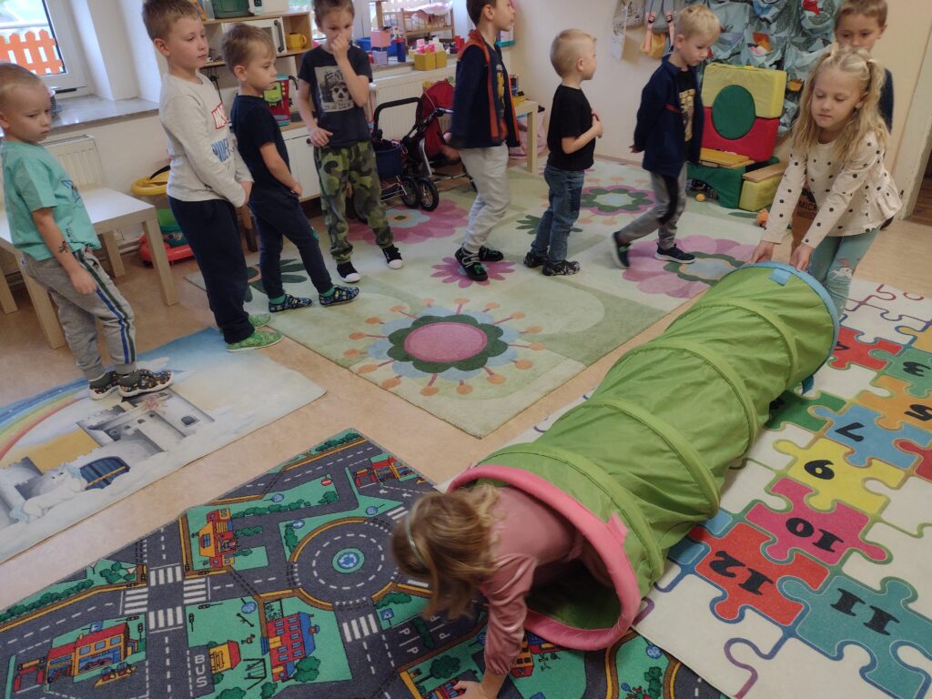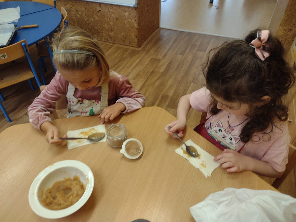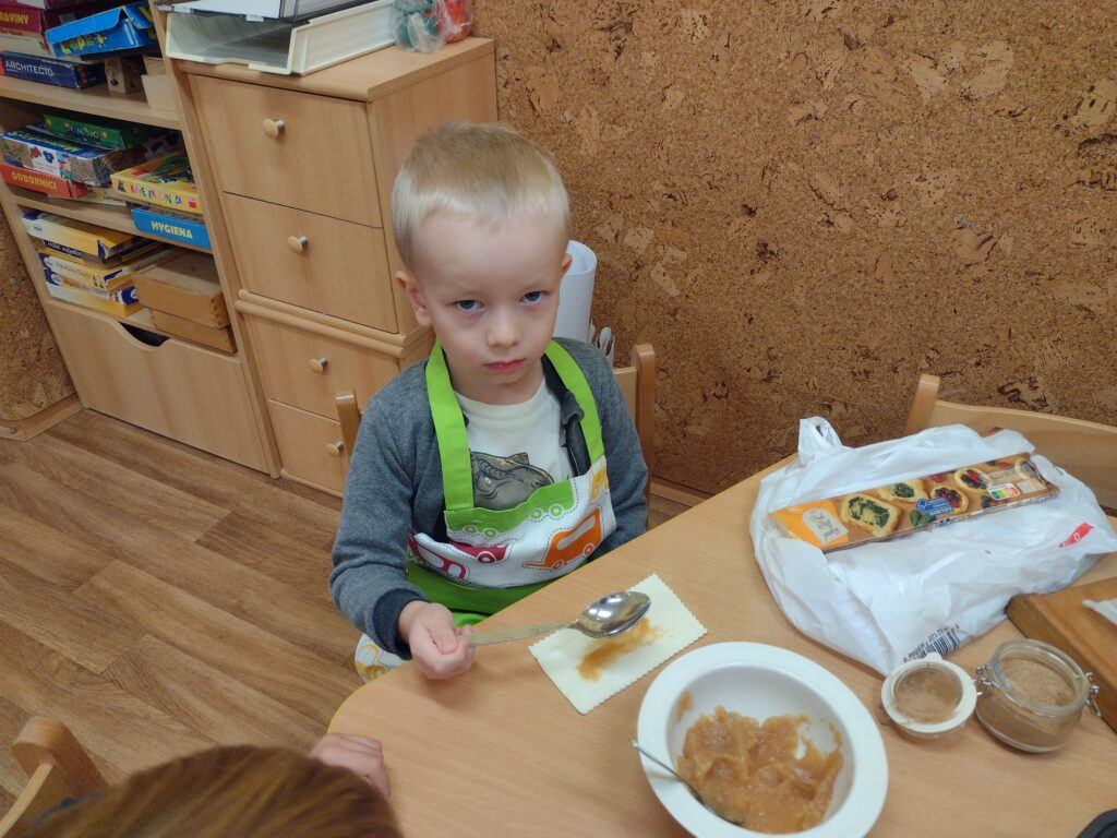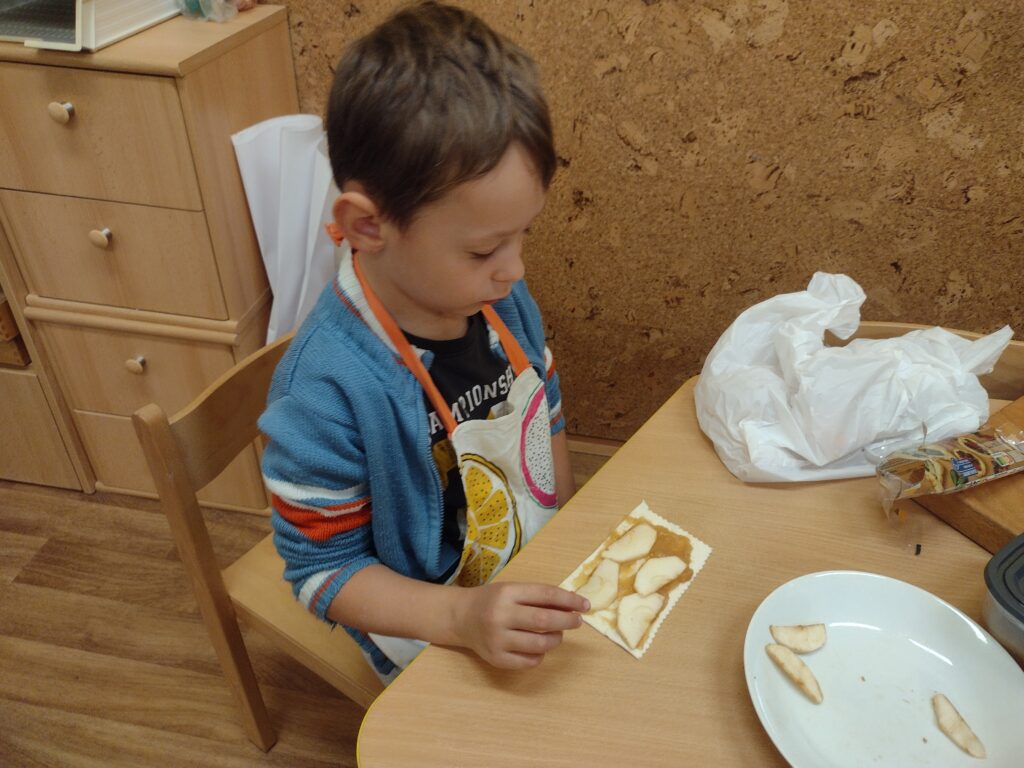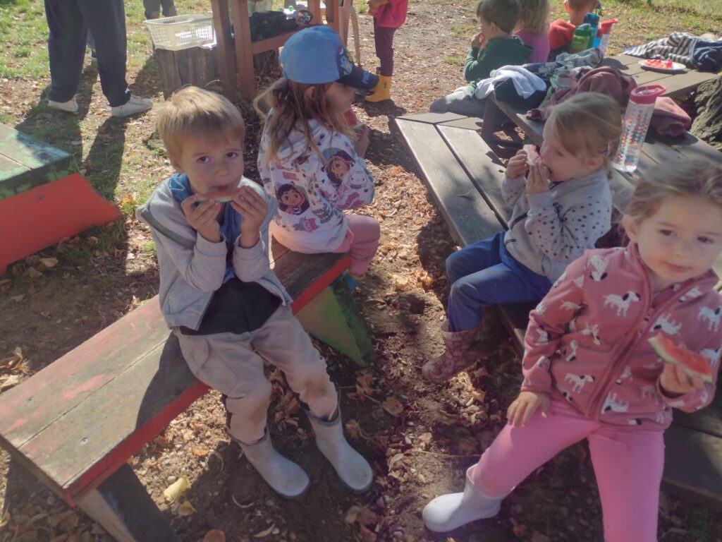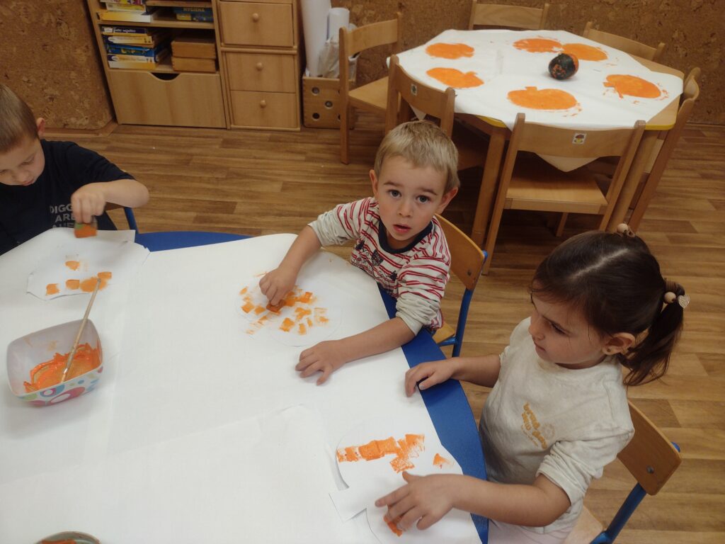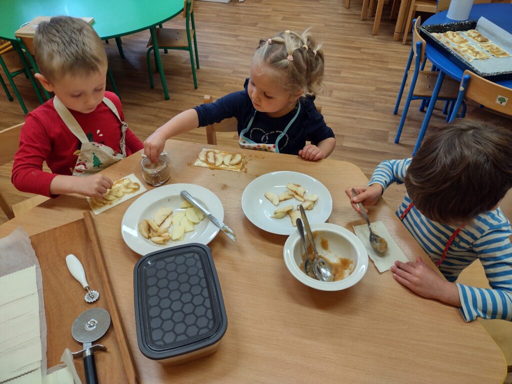Děti přivítaly podzimní vílu Jabloňku básničkou a písničkou. V lese prozkoumávaly terén a stavěly domečky z přírodnin.