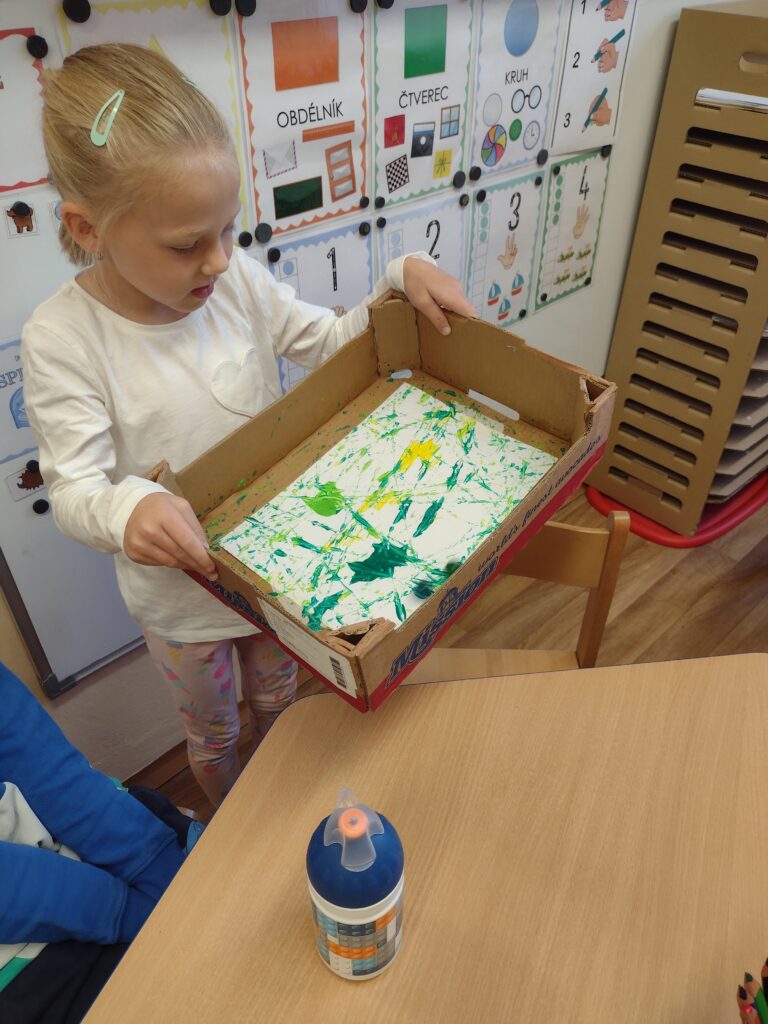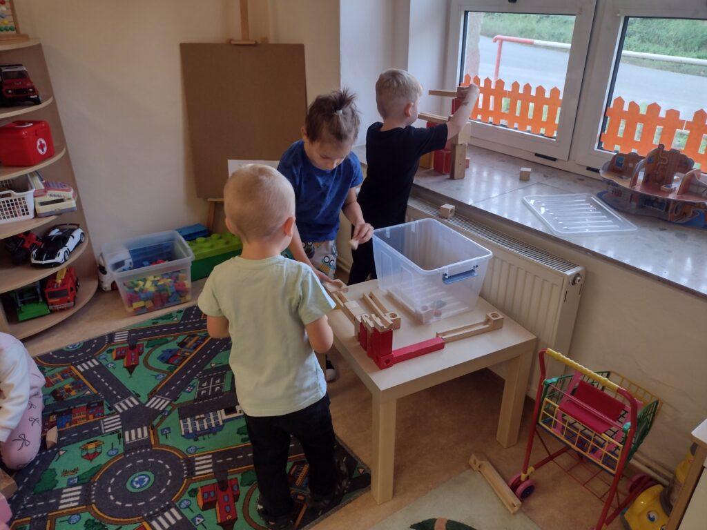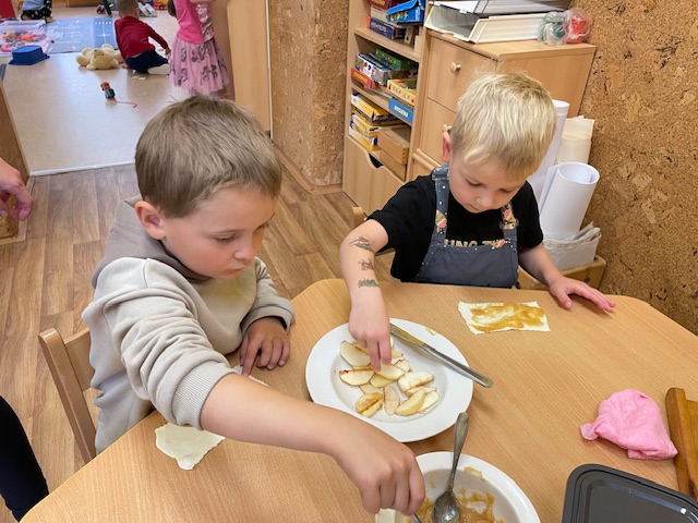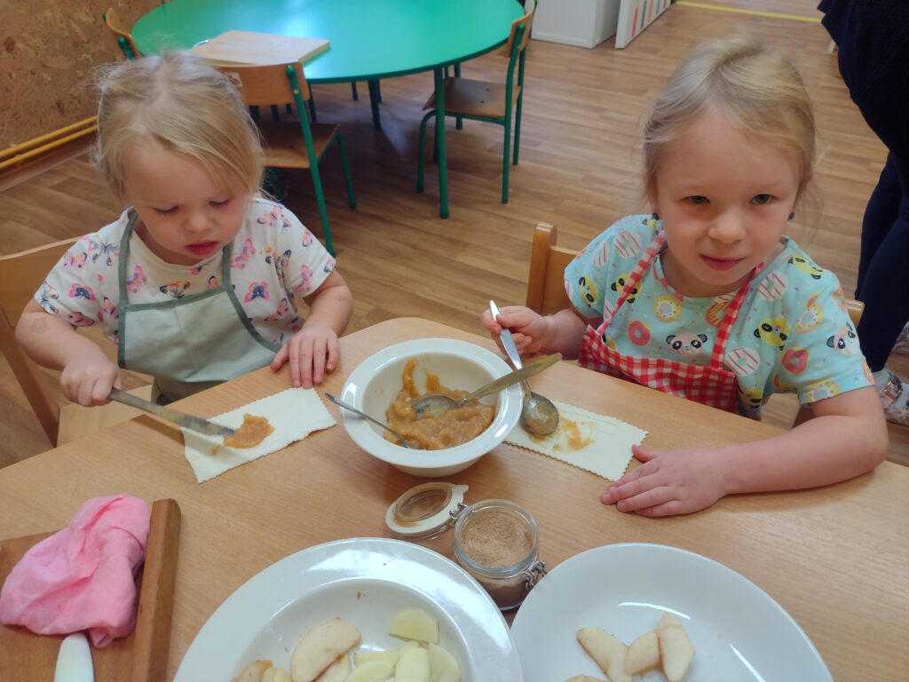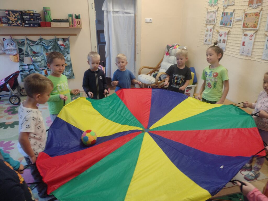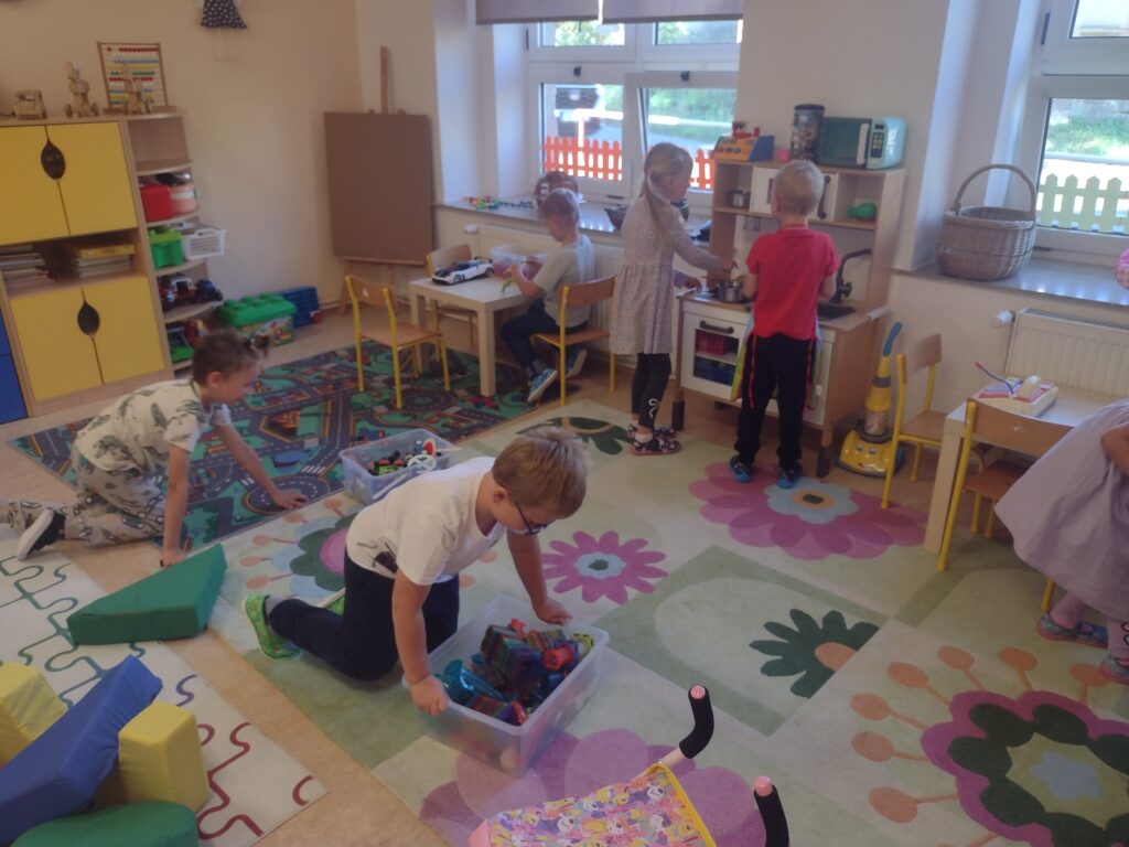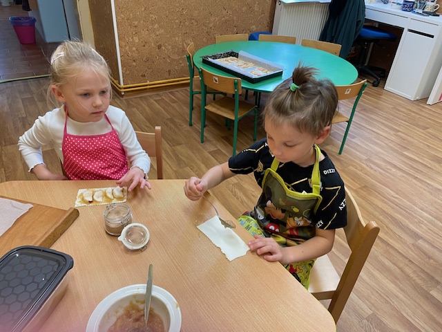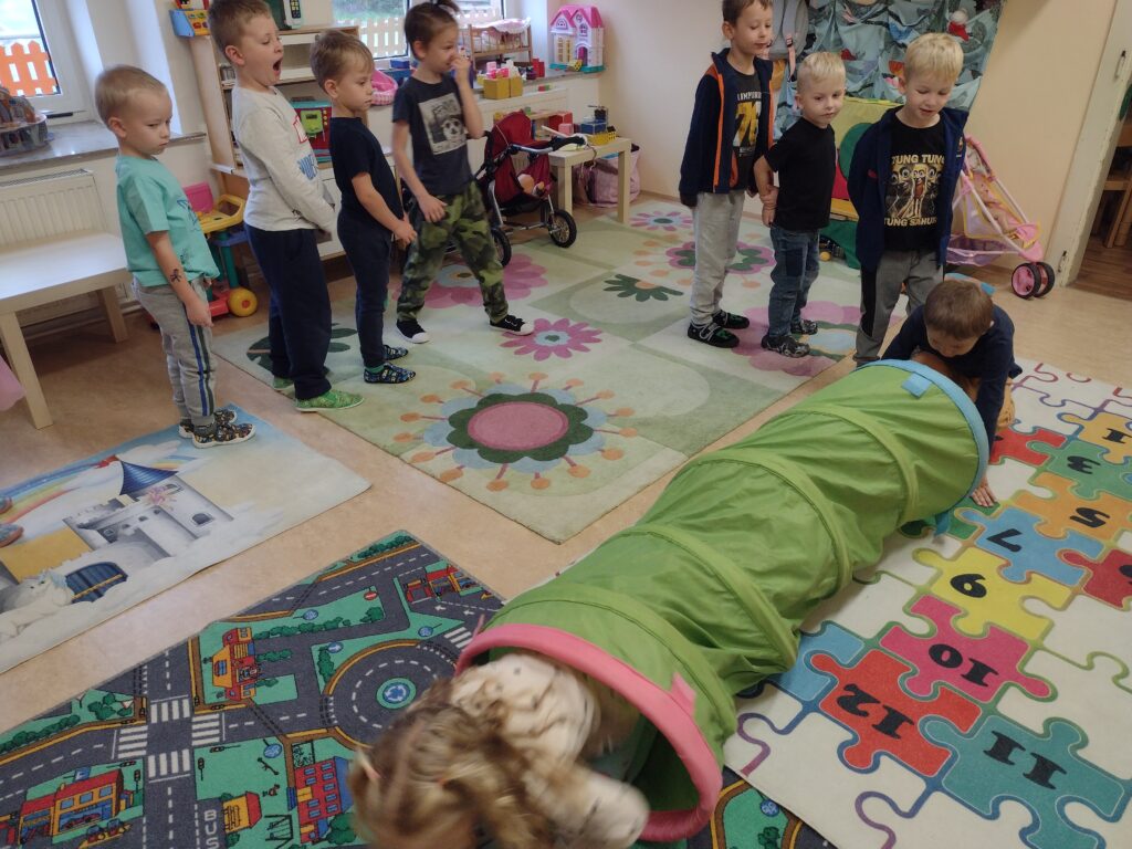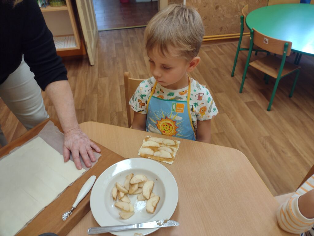 Děti přivítaly podzimní vílu Jabloňku básničkou a písničkou. V lese prozkoumávaly terén a stavěly domečky z přírodnin.