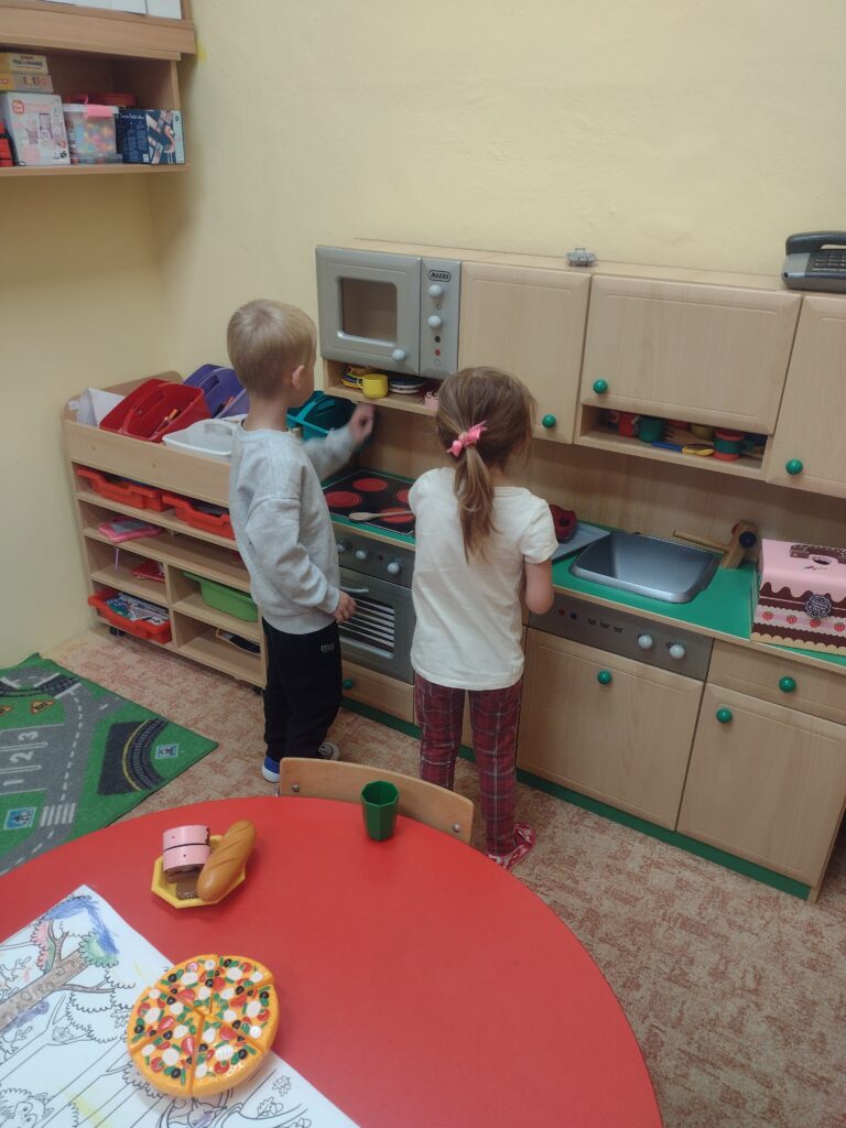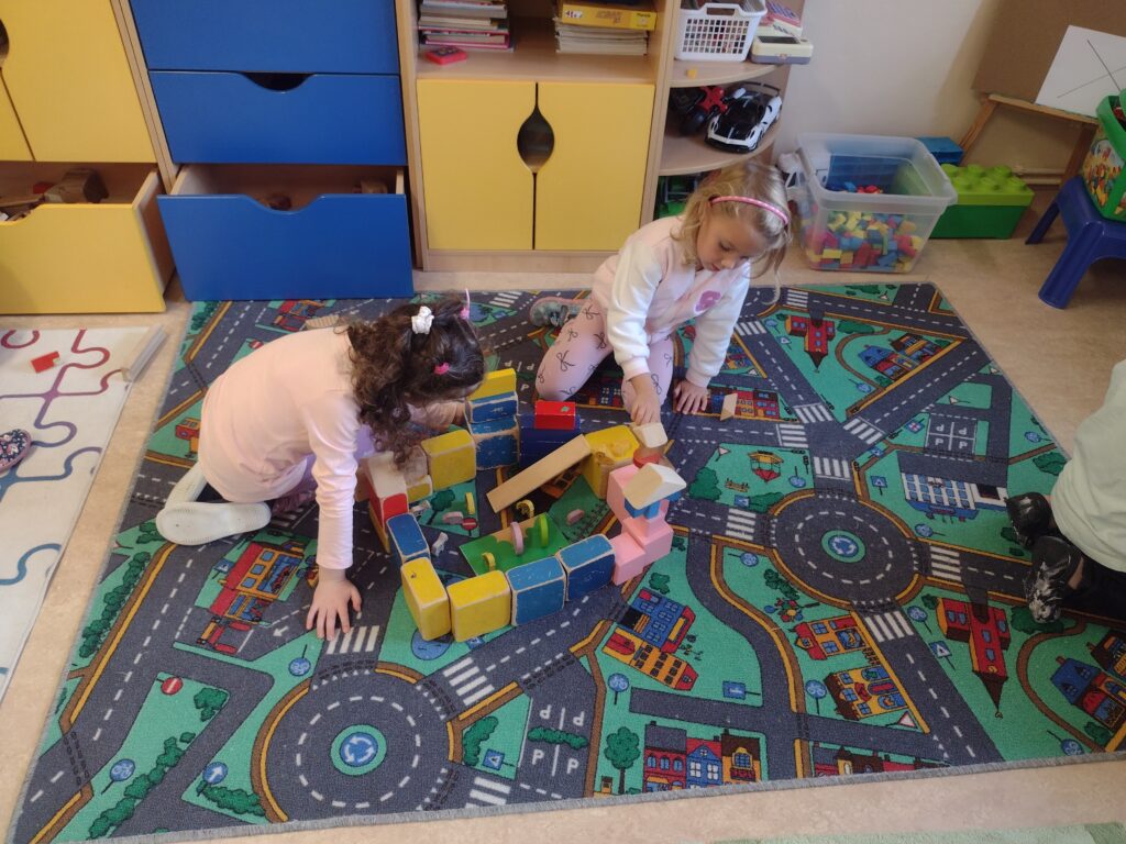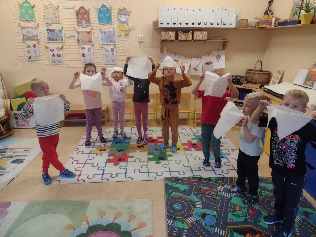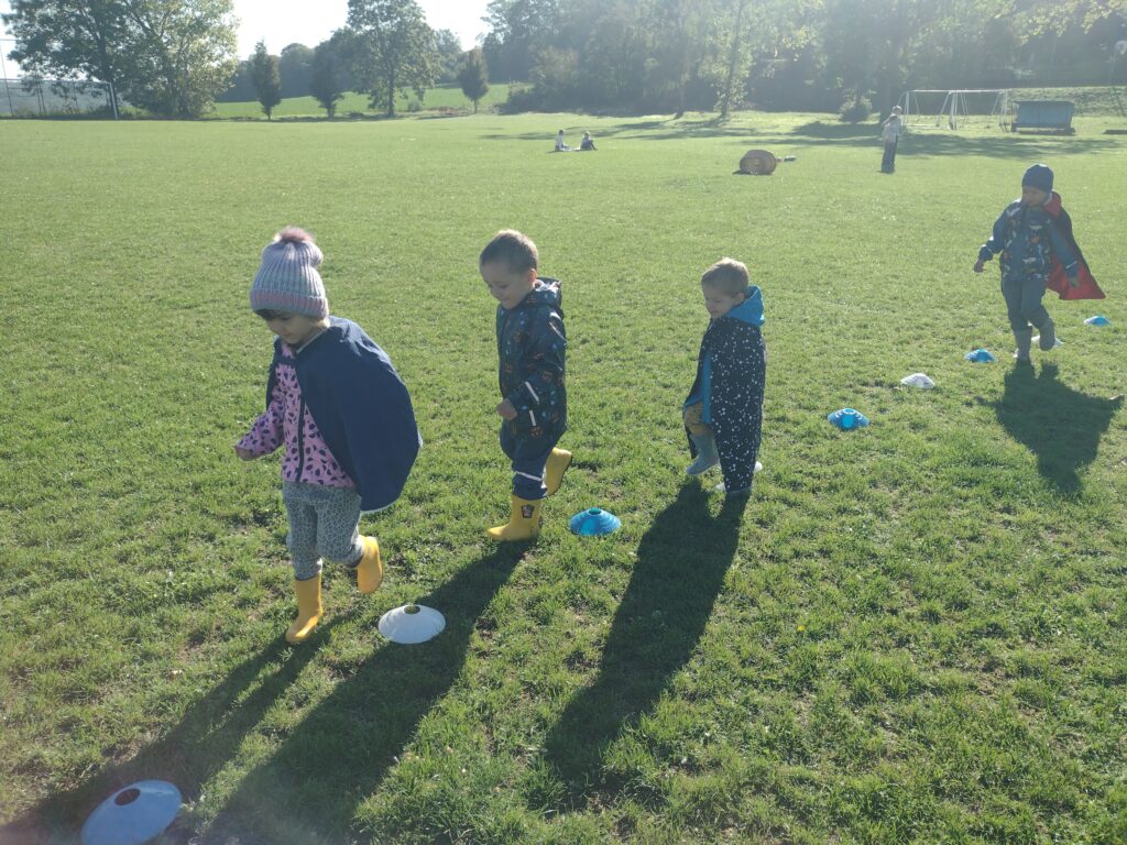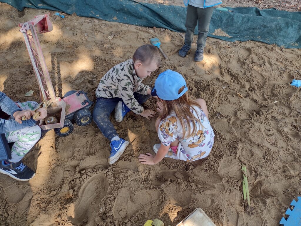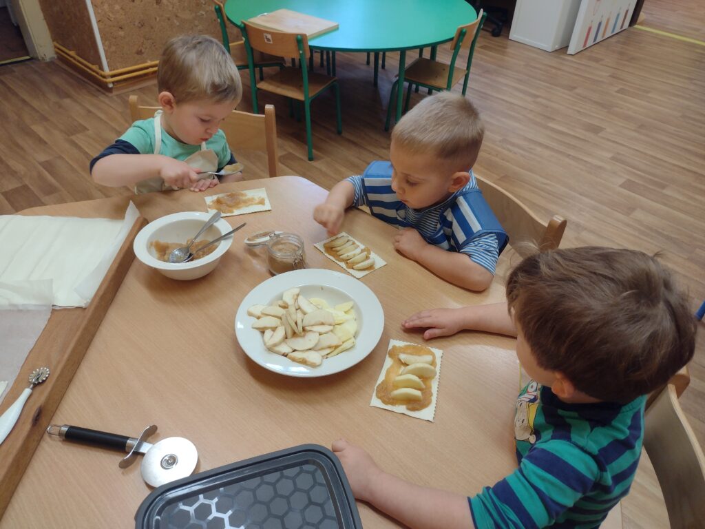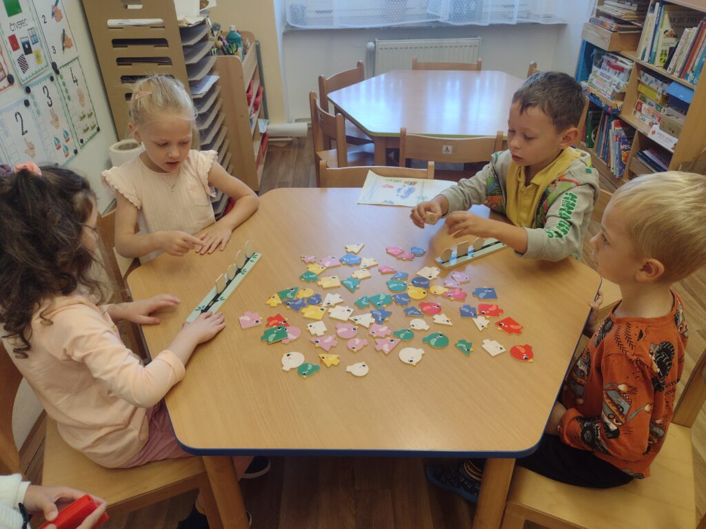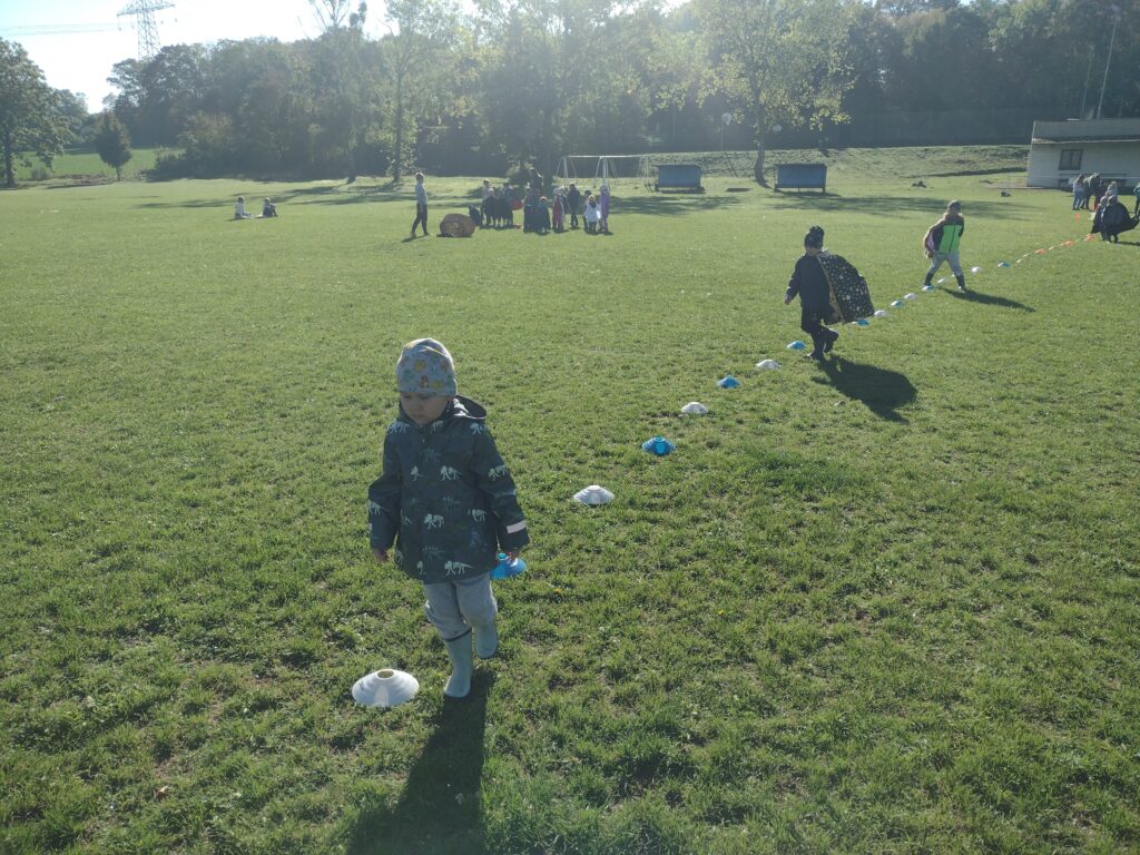 Děti přivítaly podzimní vílu Jabloňku básničkou a písničkou. V lese prozkoumávaly terén a stavěly domečky z přírodnin.